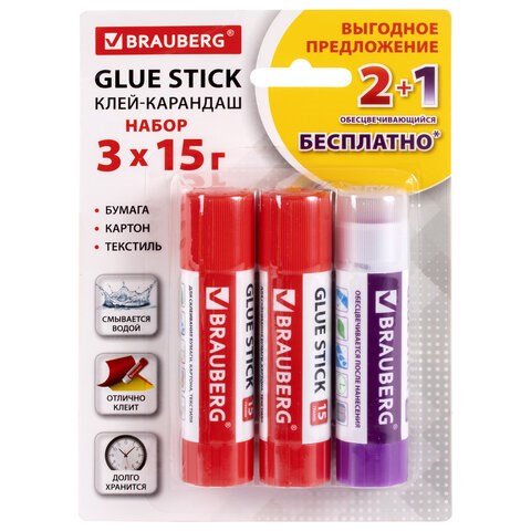Клей-карандаш "2+1 обесцвечивающийся" BRAUBERG 15 г, 3 штуки на блистере, 229474