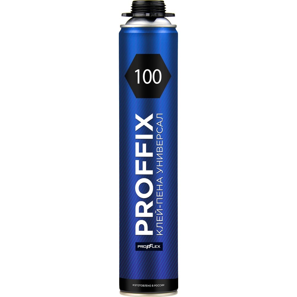 Клей-пена PROFFIX 100 - универсальный однокомпонентный полиуретановый клей-пена – применяется для быстрого и прочного склеивания большинства строительных материалов и конструкций за исключением изделий из тефлона (фторопласта), полиэтилена, полипропилена и покрытых льдом.СВОЙСТВА:Для наружных и внутренних работ;Выход клея-пены до 100 п.м. шва;Температурный диапазон применения – от -10°С до +35 °С (при температуре баллона от +10 до +35 °С);Температурный диапазон эксплуатации – от -45°С до +90 °С;Допустимый перепад высот при креплении на неровных поверхностях – 45 мм;Быстро полимеризуется - образование поверхностной пленки 10- 12 минут*;Время дальнейшей обработки изделий (сверление, дюбелирование, окраска) – 1,5 часа *;После полимеризации – химически нейтрален, не выделяет ядовитых соединений;Устойчив к плесени и грибам;Не содержит озоноразрушающих веществ и растворителей.* - при температуре +20 °С и относительной влажности 65%СФЕРА ПРИМЕНЕНИЯ:Крепление плит из формованного и экструдированного пенополистирола и других теплоизоляционных материалов на фасады зданий;Установка элементов декора из полистирола и полиуретана;Установка подоконников, откосов, наличников и иных элементов при монтаже окон и дверей;Монтаж самонесущих конструкций из пено-газобетона;Установка ориентированно стружечных плит (OSB), панелей МДФ и т.п.;Герметизация щелей между элементами теплоизоляции;Напыление на листовые материалы с целью снижения вибраций и для звукоизоляции.