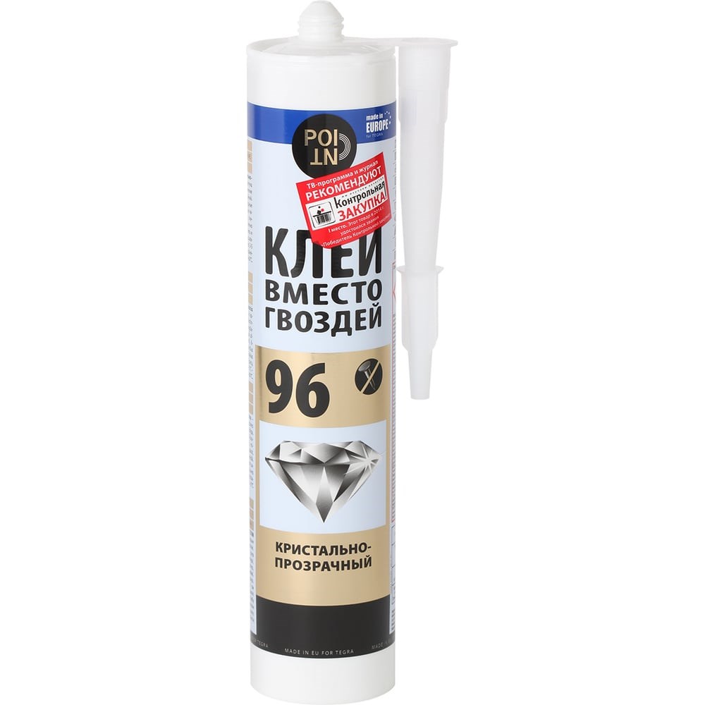 Клей вместо гвоздей 96 POINT (кристально прозрачный; 280 мл) 11601868 используют во время монтажных и отделочных работ для приклеивания реек, панелей и досок из жесткого ПВХ и древесины, кессонов, розеток и карнизов из полиуретана. Состав обеспечивает высокую липкость к большинству строительных материалов: бетон, кирпич, штукатурка, гипс, камень, дерево, металл. Продукт применяют внутри и снаружи помещений при температуре от +15ºC до +30ºC. Эластичный прозрачный клеевой шов обладает водостойкостью, быстрым начальным схватыванием, не сползает при вертикальном нанесении и обеспечивает прочное соединение деталей.