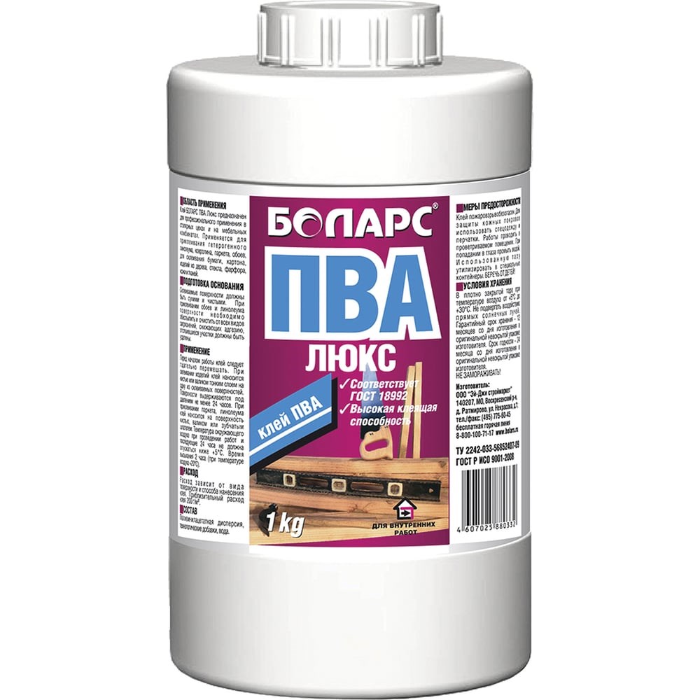 Клей ПВА БОЛАРС ЛЮКС 1 кг 00000007718 - это профессиональный клей, незаменимый в столярных цехах и на мебельных производствах. Отличается повышенной прочностью и высыхает всего за 2 часа. Состав имеет широкую сферу применения. Служит для надежного приклеивания ковролина, паркета, гетерогенного линолеума, обоев, а также для склеивания картона, бумаги, тканей, кожи, изделий из стекла и фарфора. Продукт соответствует ГОСТ Р ИСО 9001-2008.