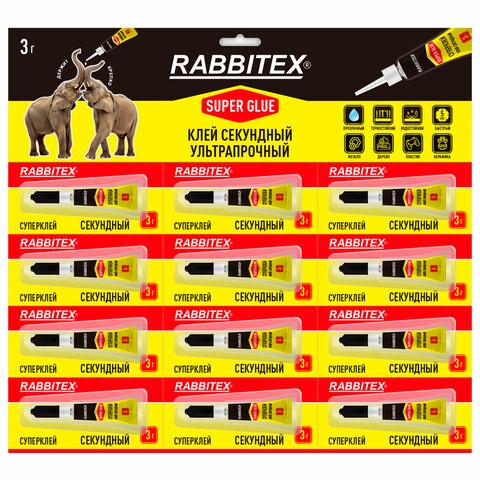 Клей секундный суперклей УЛЬТРАПРОЧНЫЙ, отрывная мультикарта 12 шт., 3 грамма, RABBITEX (РАББИТЕКС) "ДВА СЛОНА", 609810