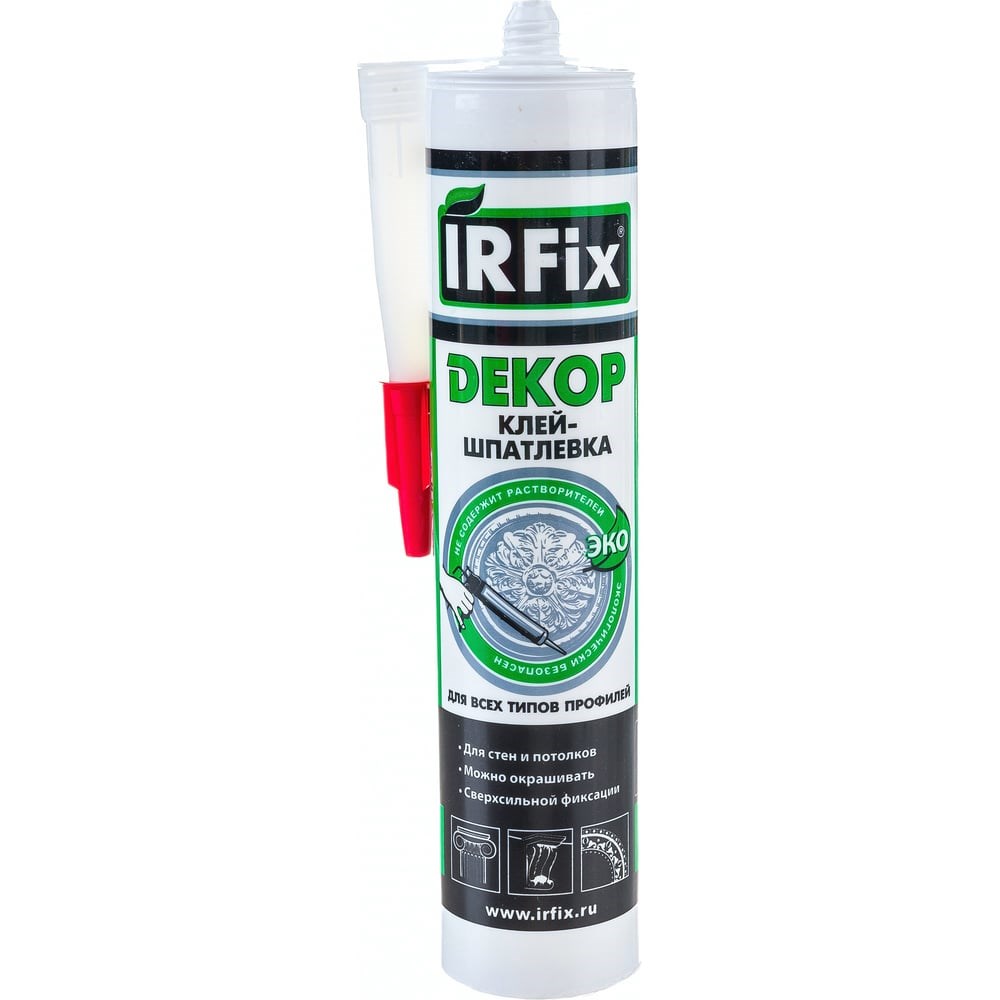 IRFix Decor Клей-шпатлёвка предназначен для надежного приклеивания и заделки швов декоративных изделий из полиуретана, пенополистирола, гипса, пенопласта и других пористых строительных материалов. Обеспечивает прочную фиксацию и позволяет аккуратно замаскировать стыки, зазоры и трещины, формируя гладкую, готовую к покраске поверхность. НазначениеМонтаж карнизов, молдингов, розеток, колонн и других элементов лепниныЗаделка стыков, щелей и соединений между элементамиМаскировка крепежей и неровностей на поверхностиПодходит для работ внутри сухих помещений