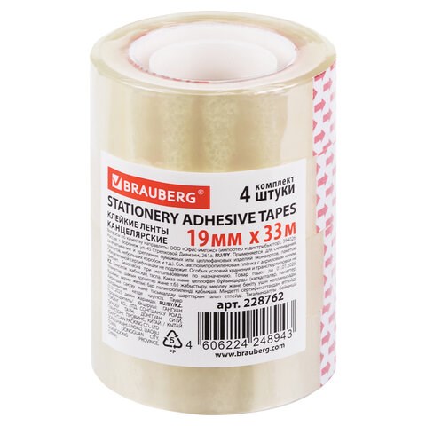 Клейкие ленты 19 мм х 33 м канцелярские BRAUBERG, КОМПЛЕКТ 4 шт., прозрачные, гарантированная длина, 228762