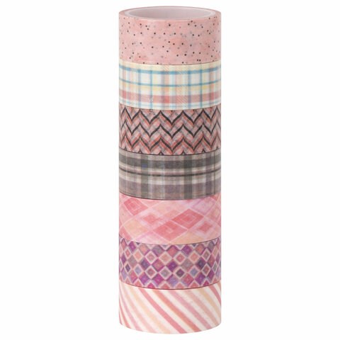 В наборе содержится 7 бумажных лент с различными дизайнами в розовых оттенках на полупрозрачной клеевой основе, каждая из которых намотана на пластиковую втулку. Ширина ленты 15 мм позволяет наклеить её даже на небольшие поделки, а длина 3 м даёт большой простор для творчества.