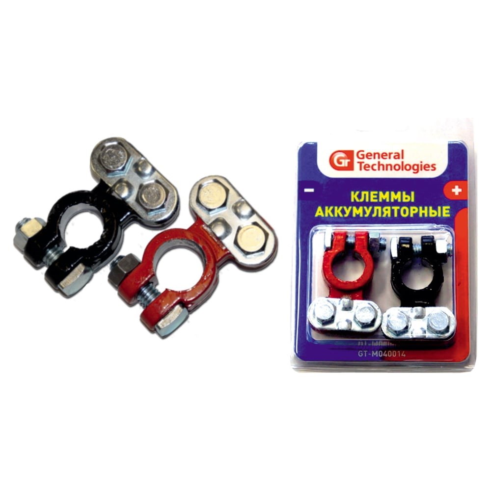 Клеммы General Technologies для АКБ под планку. Комплект: 2 шт "+" "-" (положительная и отрицательная) GT-M040014 . Предназначены для подключения АКБ. Тип клемм: EURO Type 1. Тип покрытия - лакокрасочное. Крепление под прижимную планку. Плюсовая клемма 19,5 мм. Минусовая клемма 17,9 мм. Номинальный ток: 500 А. Максимальный ток: 800 А. Сопротивление: 0,12 Ом. Материал: Свинец.