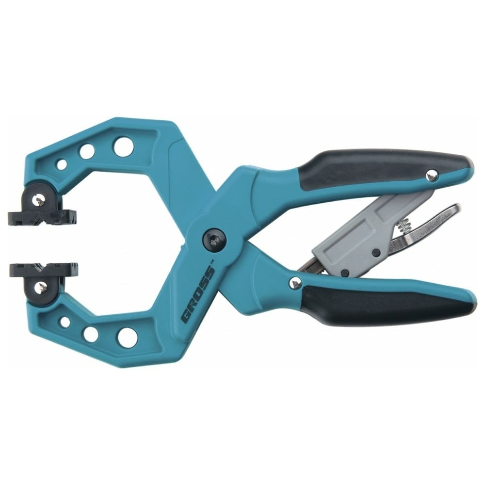 Клещеобразная струбцина Gross 20803 в пластиковом корпусе, с храповым механизмом жесткой фиксации, используется для фиксирования деталей толщиной 2-1/4 дюйма / 58 мм при их скреплении и обработке. Позволяет зажимать и удерживать заготовки из древесины и других материалов. Благодаря надежному металлическому храповому механизму губки жестко фиксируют предметы, что отличает данную модель от струбцин прищепочного типа на пружинах. Инструмент предназначен для профессионального использования.