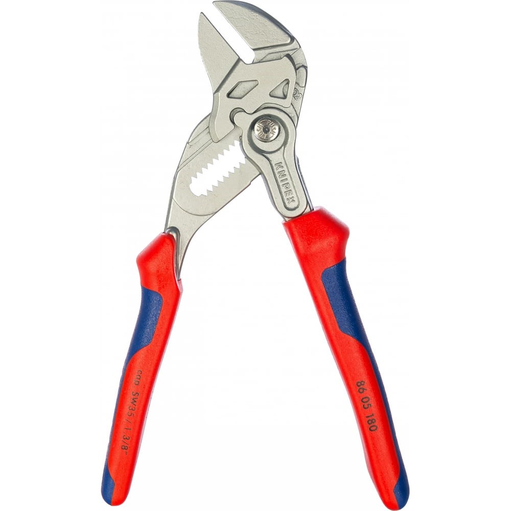 Клещевой ключ KNIPEX KN-8605180 используется для различных видов работ: опрессовка, сжатие и изгибание деталей, обламывание кафельной плитки и пр. Данный инструмент может работать как с зазором между захватными плоскостями (принцип трещоточного ключа) для быстрого отворачивания или заворачивания крепежных деталей, так и с безлюфтовым контактом по всей плоскости губок для работы с чувствительными поверхностями.