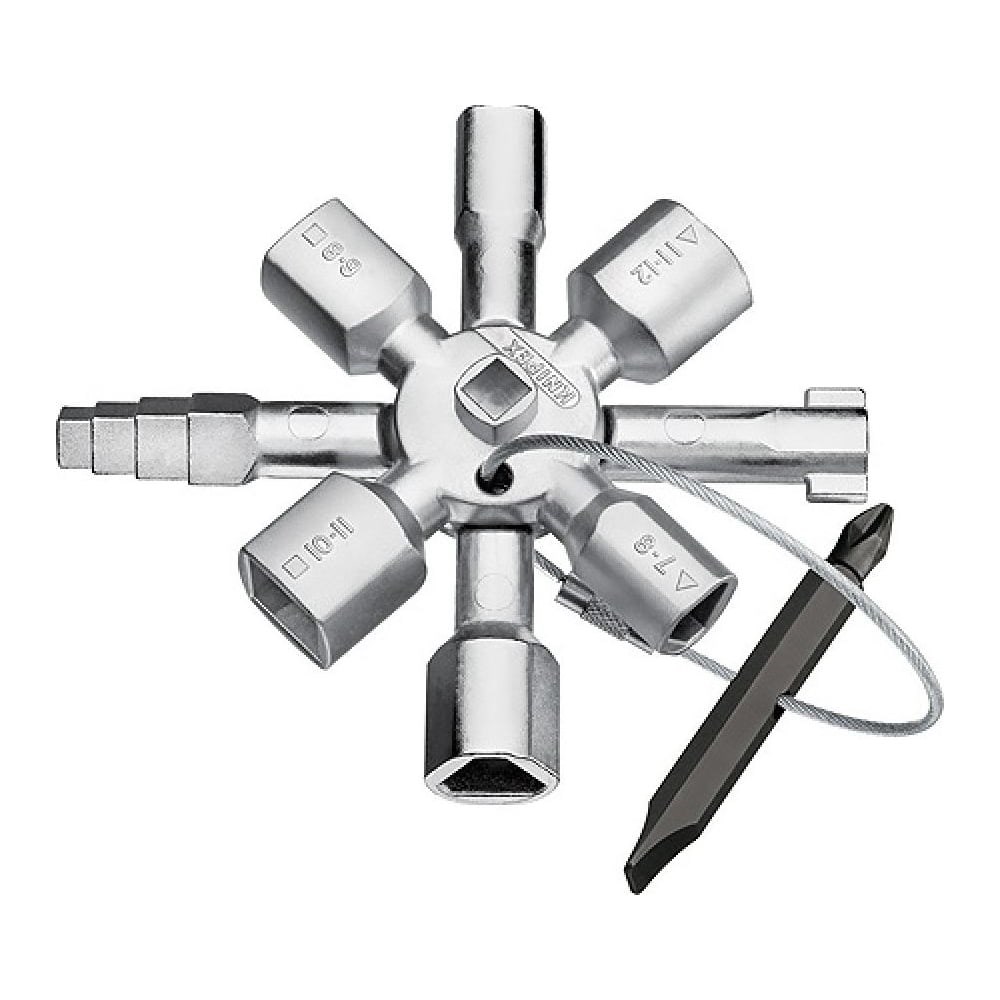 Ключ для электрошкафов с битой и переходником Knipex KN-001101 - универсальный инструмент, состоящий из двух крестовин, соединенных между собой магнитами. При изготовлении используется метод цинкового литья. Высококачественная обработка гарантирует долгий срок службы ключа. Тросик для связки крестовин выполнен из стали. Ключ подходит для всех запорных систем. Дополнительные характеристики Размеры профилей: квадрат - 5 / 6-7 / 8-9 / 10-11 мм, треугольник - 7-8 / 9-10 / 11-12 мм; Захватывающая способность полумесяц: 6 мм; Хвостовик с крылышками: 3-5 мм; Квадрат с уступами: 6-9 мм.