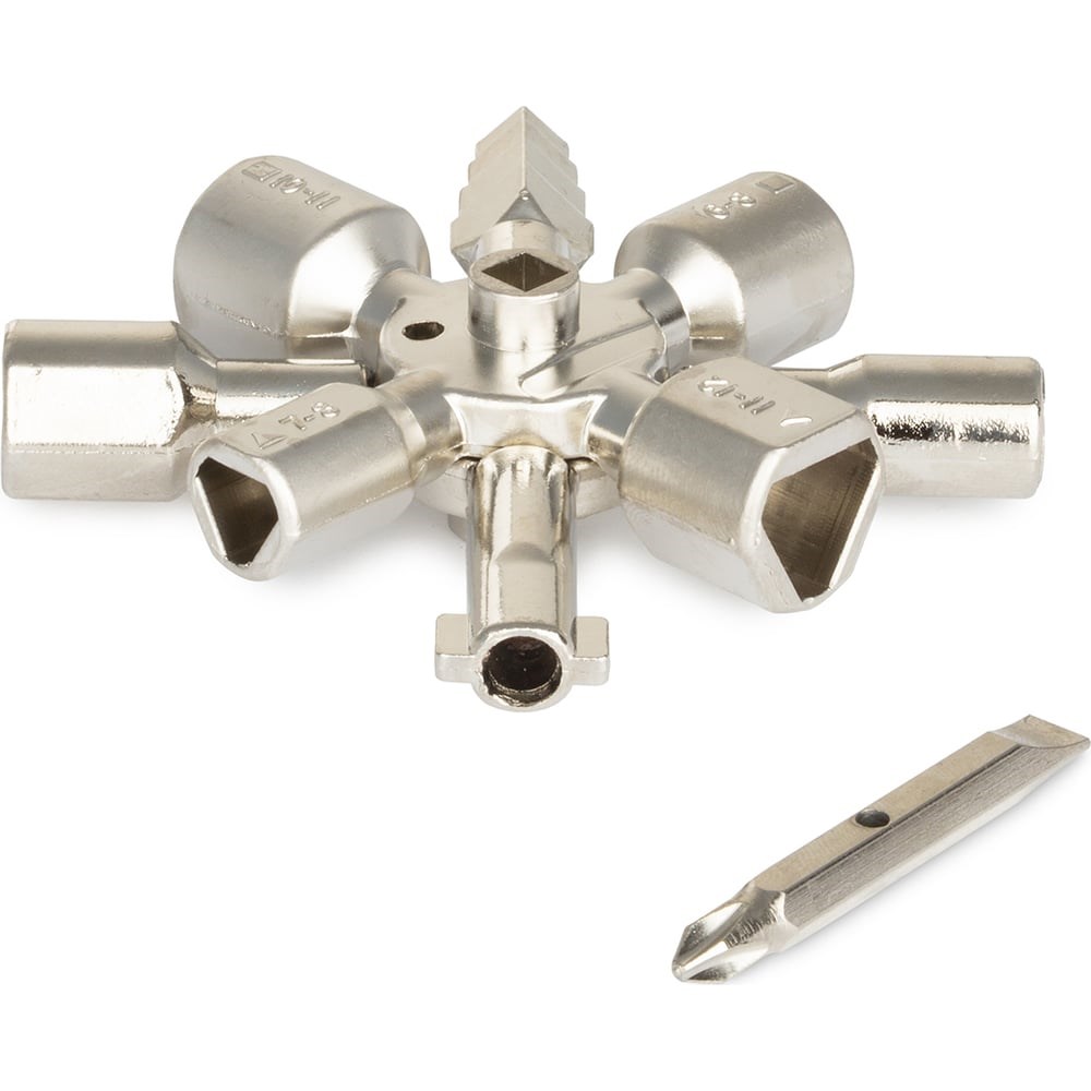 Ключ для электрошкафов с 10 рабочими профилямиКлюч для электрошкафов с 10 рабочими профилями и битой VIRA применяется для открытия электрических и сантехнических шкафов, в коммуникациях зданий и транспорта, а также в системах рециркуляции воздуха.Благодаря простой форме и небольшим размерам инструмент удобно использовать и носить с собой. Двусторонняя бита закреплена на цепочке.Материал ключа:цинковый сплав. Профили: квадрат - 6-7/ 8-9/10-11 мм, квадрат с уступами – 6-9 мм., полумесяц - 6 мм, круг с двумя бороздками – 3-5 мм., треугольник – 5-6/7-8/9-10/11-12 мм.Характеристики:Материал ключа: цинковый сплав (ЦАМ(ZAMAK))Количество профилей: 10Особенности: удобно использовать и носить с собойНазначение: для открытия электрических и сантехнических шкафов, в коммуникациях зданий и транспорта, а также в системах рециркуляции воздухаОбратите внимание: перед открытием или закрытием замка необходимо убедиться в соответствии ему профиля ключа