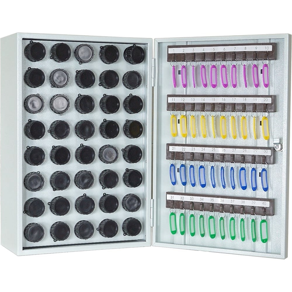 Ключница + 40 пеналов МЕТКОН КЛ-40П MT_03_012_05_Ss представляет собой металлическую конструкцию габаритами 525х350х180 мм с толщиной стенки 1 мм. Отверстия в задней стенке допускают крепление модели к стене. 4 вешалки служат для хранения ключей в количестве 40 штук. Брелоки приобретаются дополнительно. Помимо ключей шкафчик используется для размещения 40 пеналов (длина в закрытом состоянии 110 мм, диаметр основания/крышки 35/40 мм). Вес равен 7 кг, объем - 0.03 м3. Замок - «Cam-Lock».