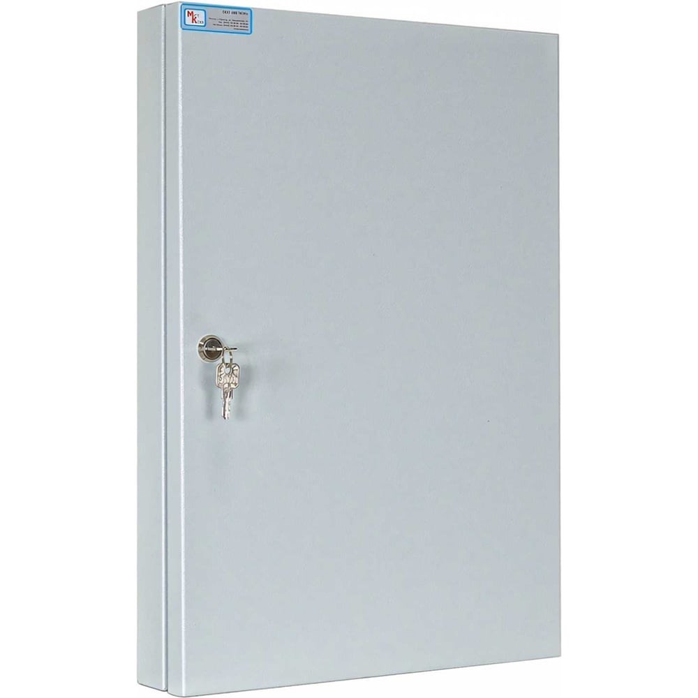 Ключница + 80 брелоков МЕТКОН КЛ-80Б представляет собой металлическую конструкцию габаритами 525х350х75 мм с толщиной стенки 1 мм. Отверстия в задней стенке допускают крепление модели к стене. Есть 8 планок для навешивания 80 комплектов ключей. Вес шкафчика составляет 5 кг. Замок - «Cam-Lock». Компактная ключница не занимает большой объем полезного пространства гостиницы, медицинского центра, школы.