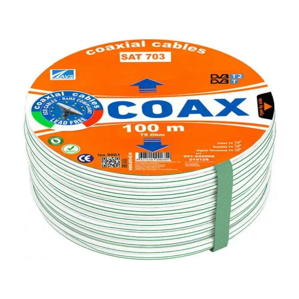 SAT 703 — коаксиальный телевизионный кабель, востребованный при создании систем кабельного и эфирного TV, подключении спутниковых антенн. Конструкция изделия включает: центральную жилу, двойной защитный экран — алюминиевую фольгу на полимерной основе, омедненную оплетку из 48 нитей с оловянным покрытием, внешнюю оболочку из белого ПВХ-пластиката. Кабель обеспечивает качественную передачу видеосигнала без искажений даже на большие расстояния, подходит для монтажа внутри и снаружи зданий.