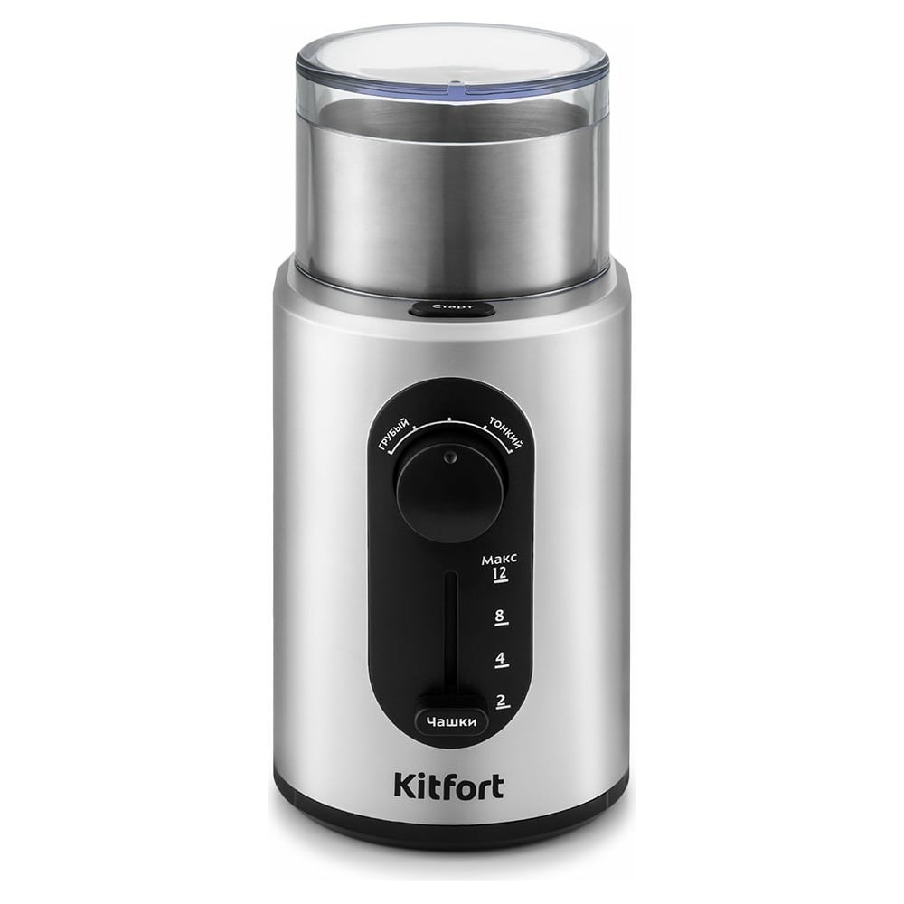 Кофемолка KITFORT КТ-748 предназначена для помола кофейных зёрен и измельчения специй и орехов. Кнопка включения расположена на корпусе около чаши. Защитный механизм не позволит включить кофемолку, если крышка установлена неправильно. Прибор оснащён регуляторами степени помола и количества чашек. В чаше установлен двухлезвийный нож-дробилка для эффективного измельчения зёрен кофе, специй или орехов. Кофемолка укомплектована съёмной чашей из нержавеющей стали и прозрачной крышкой, а на дне есть специальные прорезиненные нескользящие ножки.