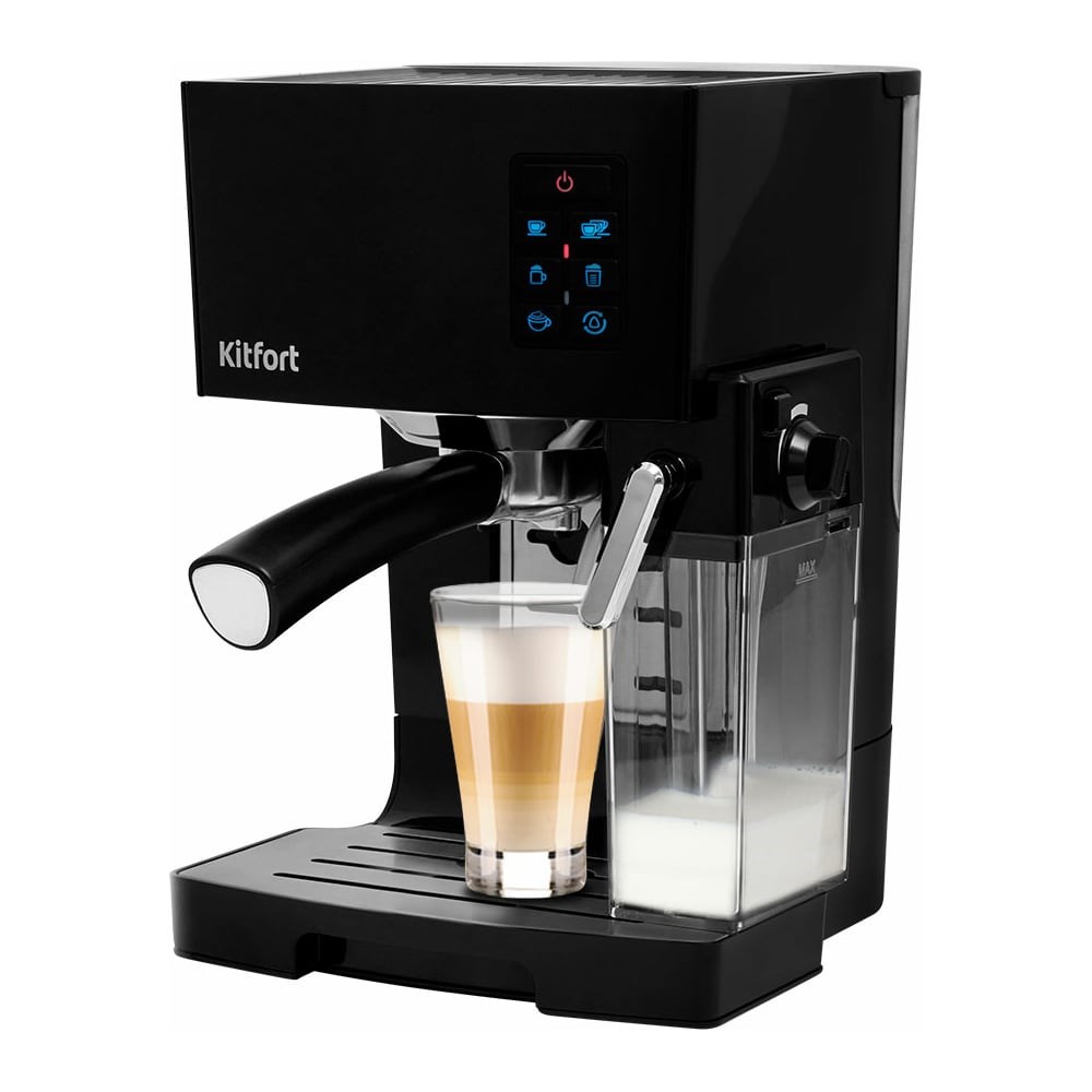Кофеварка KITFORT КТ-743 приготовит ароматный кофе эспрессо, капучино или латте, а также множество других видов кофе. Одна порция готовится 25 - 30 секунд. Кофе получается восхитительно вкусным, ароматным и с пенкой. Данная модель имеет встроенный капучинатор. Нужно только залить в него пастеризованное молоко 2,5-3,5% жирности, включить его, выбрать нужный напиток и установить интенсивность подачи молока/молочной пенки. Кнопками на панели управления выбирается тип напитка: эспрессо, капучино или латте, желаемый объём напитка, а также включается и выключается капучинатор. Кнопка режима самоочистки служит для включения очистки капучинатора. Резервуар для воды объёмом 1,4 л легко снимается и наполняется водой. Также его удобно чистить. Если вода в резервуаре закончится, об этом сообщит специальный индикатор отсутствия воды. В комплекте к кофеварке идёт ложка-темпер. Темпер используется для утрамбовки молотого кофе и как мерная ложка.