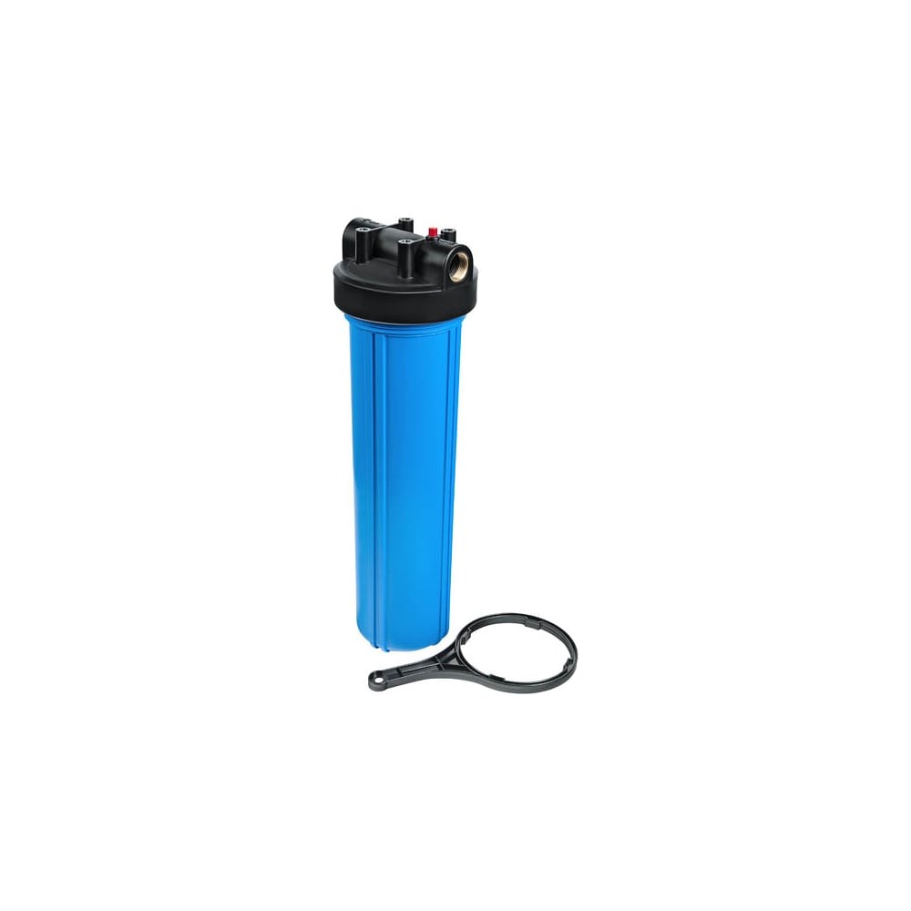 Колба фильтра состоит из: оголовка-крышки с латунными вставками на выходах для подключения к магистрали. На крышке нанесены стрелки направления движения водной среды (предусмотрен воздушный клапан в виде красной кнопки для удаления воздуха после замены картриджа), полипропиленовой колбы синего цвета, сменного ключа, металлического кронштейна крепления. В комплекте поставки также предусмотрены 4 винта для крепления фильтра к кронштейну. Длина колбы — 10 дюймов. Присоединительный размер — 1 дюйм. Диаметр колбы — 190 мм. Максимальное рабочее давление — 0,6 МПа/ 6 bar. Давление разрыва: для колб 10" — 22-24 bar, для колб 20" — 24-26 bar. Максимальная рабочая температура — +40°С. Срок службы колбы — до 10 лет.