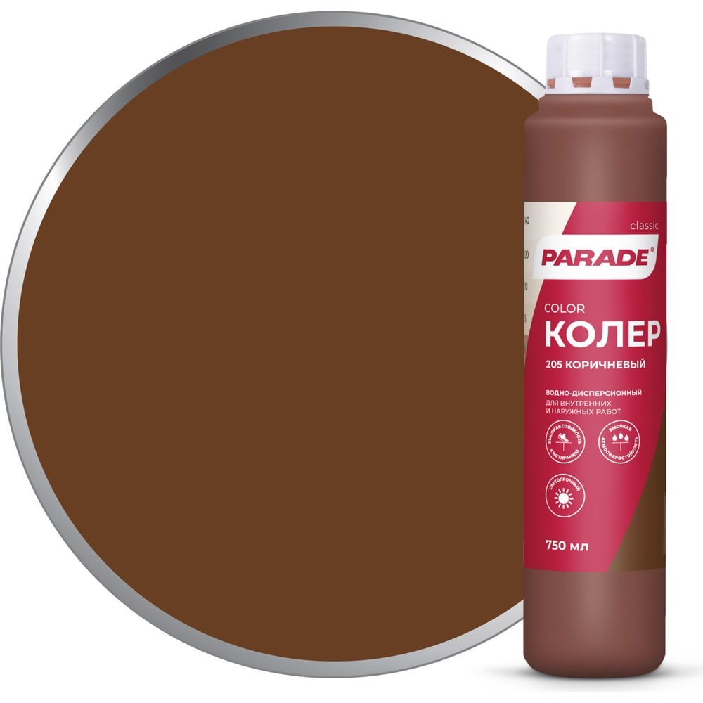 Колер PARADE №205 коричневый 0,75 л Россия 90001421824 - экологически чистый колер. Предназначен для тонирования всех видов красок, шпатлевок и декоративных штукатурок на водной основе. Для внутренних и наружных работ.