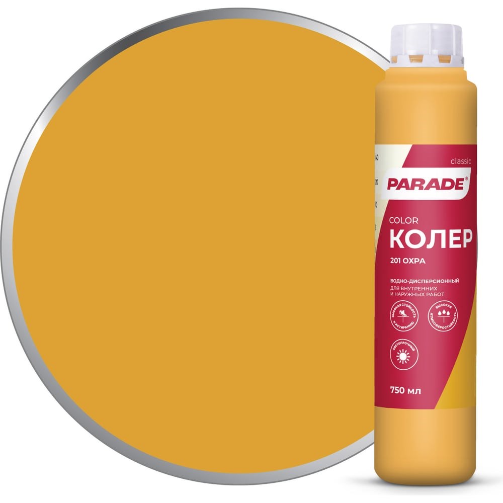 Колер PARADE №201 охра 0,75 л Россия 90001421827 - экологически чистый колер. Предназначен для тонирования всех видов красок, шпатлевок и декоративных штукатурок на водной основе. Для внутренних и наружных работ.