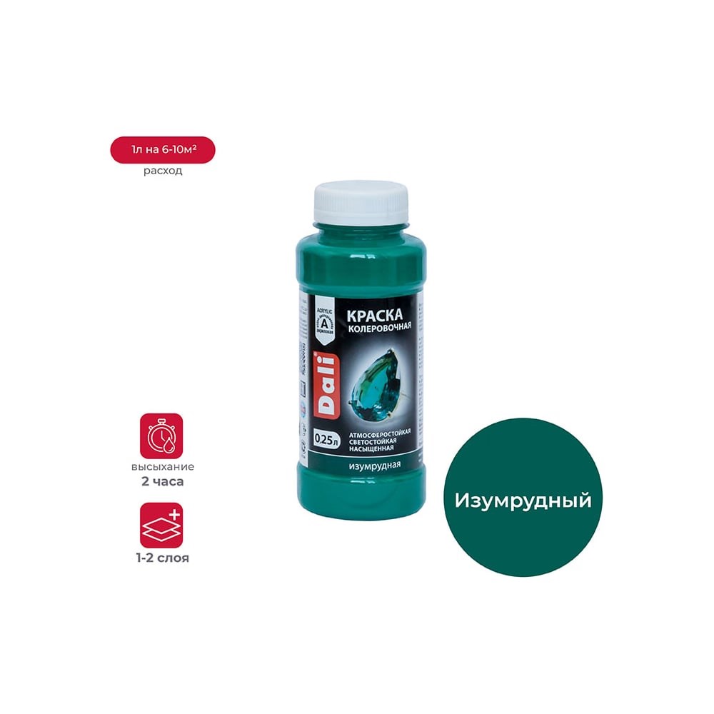 Предназначена для колеровки водно-дисперсионных строительных и декоративных материалов и художественных и оформительских работ, роспись, декорирование. Применяется внутри и снаружи помещений: для тонирования водно-дисперсионных красок, эмалей, шпатлевок, декоративных штукатурок и др. в качестве самостоятельного покрытия по любым поверхностям, в т.ч. ранее окрашенным. Перед применением интенсивно встряхнуть. Для самостоятельного применения: Поверхность должна быть сухой, чистой. Краску наносить в 2 слоя с промежуточной сушкой 1 час. Для колеровки водно-дисперсионных ЛКМ: понемногу добавлять в колеруемый материал, постоянно перемешивая до получения желаемого оттенка. Для получения более точного результата, руководствоваться вариантами разбелов по Карте цветов Краски колеровочной DALI™ Допускается смешивание различных цветов между собой. Метод нанесения: кисть, валик, распыление. Определяется колеруемым материалом. Температура применения: от +10°С, относительная влажность воздуха менее 80%. Количество слоев: 1-2. Расход: в 1 слой 1л на 6-10м² (в качестве самостоятельного покрытия). Высыхание: при t° +20±2°C межслойная сушка - 1 час, полное высыхание – 2 часа, окончательный набор прочности покрытия – 24 часа. Степень глянца: матовый. Степень перетира: мкм не более 30. Очистка инструмента: вода. Хранение и транспортировка: при t° от +5° до +35°С выдерживает однократное нециклическое замораживание на срок до 30 суток. Изумрудный