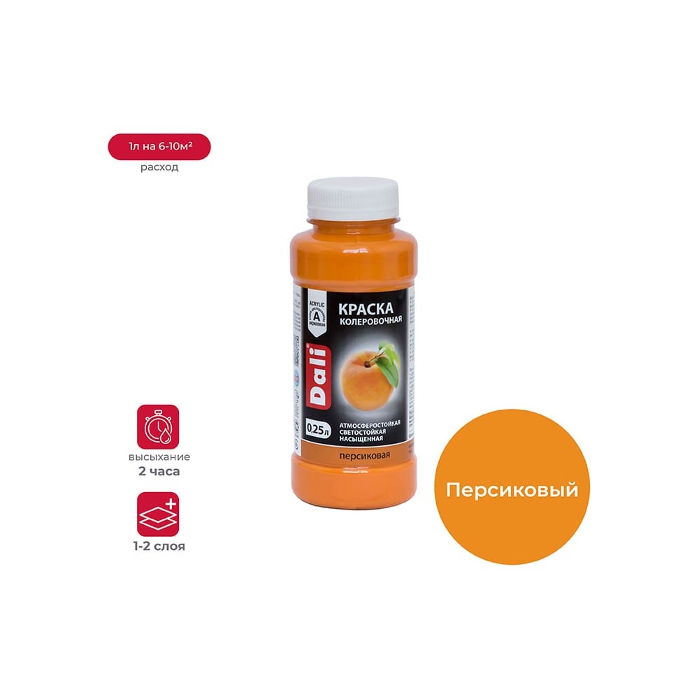 Предназначена для колеровки водно-дисперсионных строительных и декоративных материалов и художественных и оформительских работ, роспись, декорирование. Применяется внутри и снаружи помещений: для тонирования водно-дисперсионных красок, эмалей, шпатлевок, декоративных штукатурок и др. в качестве самостоятельного покрытия по любым поверхностям, в т.ч. ранее окрашенным. Перед применением интенсивно встряхнуть. Для самостоятельного применения: Поверхность должна быть сухой, чистой. Краску наносить в 2 слоя с промежуточной сушкой 1 час. Для колеровки водно-дисперсионных ЛКМ: понемногу добавлять в колеруемый материал, постоянно перемешивая до получения желаемого оттенка. Для получения более точного результата, руководствоваться вариантами разбелов по Карте цветов Краски колеровочной DALI™ Допускается смешивание различных цветов между собой. Метод нанесения: кисть, валик, распыление. Определяется колеруемым материалом. Температура применения: от +10°С, относительная влажность воздуха менее 80%. Количество слоев: 1-2. Расход: в 1 слой 1л на 6-10м² (в качестве самостоятельного покрытия). Высыхание: при t° +20±2°C межслойная сушка - 1 час, полное высыхание – 2 часа, окончательный набор прочности покрытия – 24 часа. Степень глянца: матовый. Степень перетира: мкм не более 30. Очистка инструмента: вода. Хранение и транспортировка: при t° от +5° до +35°С выдерживает однократное нециклическое замораживание на срок до 30 суток. Персик