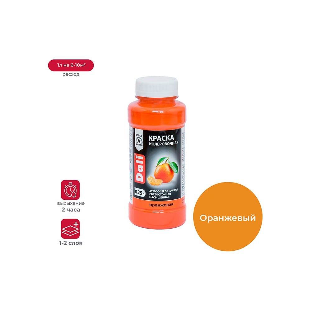 Предназначеня для колеровки водно-дисперсионных строительных и декоративных материалов и художественных и оформительских работ, роспись, декорирование. Применяется внутри и снаружи помещений: для тонирования водно-дисперсионных красок, эмалей, шпатлевок, декоративных штукатурок и др. в качестве самостоятельного покрытия по любым поверхностям, в т.ч. ранее окрашенным. Перед применением интенсивно встряхнуть. Для самостоятельного применения: Поверхность должна быть сухой, чистой. Краску наносить в 2 слоя с промежуточной сушкой 1 час. Для колеровки водно-дисперсионных ЛКМ: понемногу добавлять в колеруемый материал, постоянно перемешивая до получения желаемого оттенка. Для получения более точного результата, руководствоваться вариантами разбелов по Карте цветов Краски колеровочной DALI™ Допускается смешивание различных цветов между собой. Метод нанесения: кисть, валик, распыление. Определяется колеруемым материалом. Температура применения: от +10°С, относительная влажность воздуха менее 80%. Количество слоев: 1-2. Расход: в 1 слой 1л на 6-10м² (в качестве самостоятельного покрытия). Высыхание: при t° +20±2°C межслойная сушка - 1 час, полное высыхание – 2 часа, окончательный набор прочности покрытия – 24 часа. Степень глянца: матовый. Степень перетира: мкм не более 30. Очистка инструмента: вода. Хранение и транспортировка: при t° от +5° до +35°С выдерживает однократное нециклическое замораживание на срок до 30 суток. Оранжевый