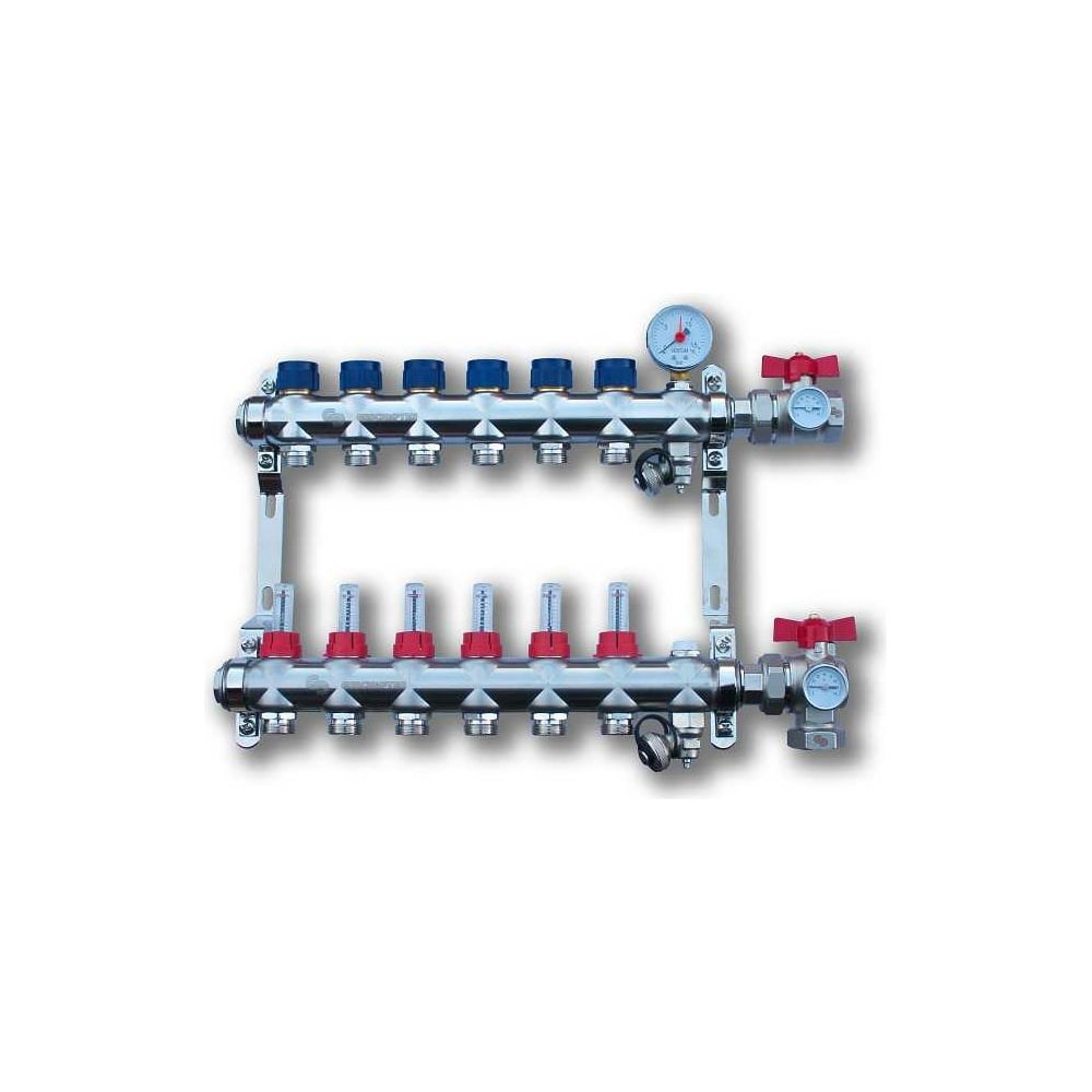 Внимание! Изображение отличается от реального, ориентируйтесь на условные характеристики. Коллектор из нержавеющей стали Geschaften 2 выхода, евроконус 3/4, с раcходомерами GS1185-2 для систем теплого пола и отопления. Предназначен для распределения теплоносителя от источника тепла к отопительными приборами (контурам теплого пола, радиаторам и т.д.). Отличие в том, что на каждом контуре вместо балансировочного клапана установлен расходомер, ещё одно название ротаметр. Расходомер позволяет визуально контролировать скорость потока (л/м) теплоносителя через контур. На коллектор может быть установлена покомнатная автоматика (электропривод и комнатный термостат) для гибкой регулировки температуры в помещениях и экономии затрат на отопление. Коллектор имеет универсальное подключение G 3/4" (евроконус) для подсоединения контуров (трубы диаметром от 12 до 20 мм).