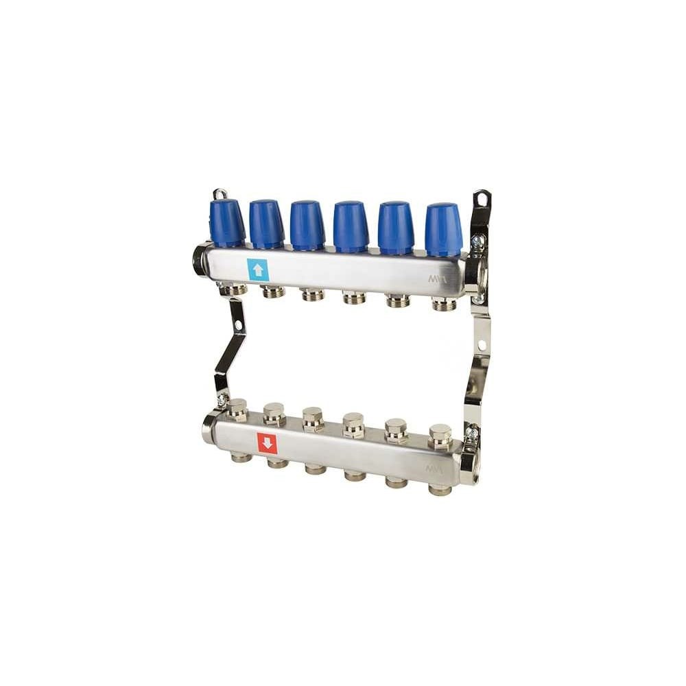 Коллектор MVI из нержавеющей стали, в сборе без расходомеров, 6 выходов MS.406.06 предназначен для распределения потока рабочей среды систем водяного отопления по потребителям. При этом под «потребителем» понимается отдельный нагревательный прибор или группа приборов, контур или петля «теплого пола», отдельные части или ветви системы. Коллекторный блок объединяет в себе подающий и обратный коллекторы из нержавеющей стали, запорные клапаны, термостатические клапаны (с возможностью установки электротермического сервопривода) и крепежные кронштейны. Присоединение циркуляционных петель осуществляется с помощью фитингов стандарта «евроконус» 3/4" (НР).