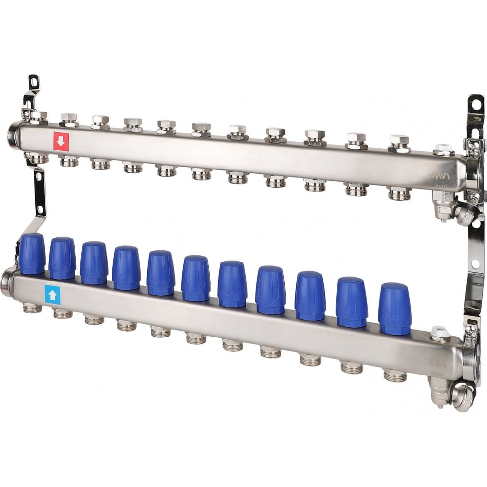 Коллектор MVI из нержавеющей стали, в сборе без расходомеров, с дренажным краном и воздухоотводчиком MS.611.06 предназначен для распределения потока рабочей среды систем водяного отопления по потребителям. При этом под «потребителем» понимается отдельный нагревательный прибор или группа приборов, контур или петля «теплого пола», отдельные части или ветви системы. Коллекторный блок объединяет в себе подающий и обратный коллекторы из нержавеющей стали, запорные клапаны, термостатические клапаны (с возможностью установки электротермического сервопривода) и крепежные кронштейны. Присоединение циркуляционных петель осуществляется с помощью фитингов стандарта «евроконус» 3/4" (НР).