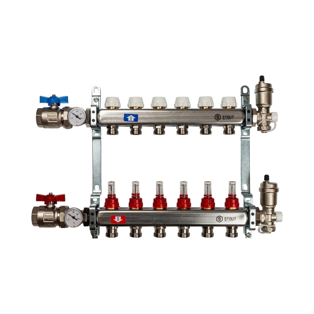 Коллектор из нержавеющей стали в сборе с расходомерами STOUT 6 выходов SMS 0907 000006 обеспечивает регулировку и распределение теплоносителя в системах водяного отопления или теплого пола. Конструкция оснащена двумя шаровыми кранами, которыми можно перекрыть систему полностью. Представляет собой надежный и долговечный элемент за счет: высокой пропускной способности; способности выдерживать давление до 10 бар; максимально выдерживаемой температуры теплоносителя до 100 °С; корпуса из нержавеющей стали; балансировочного расходомера.