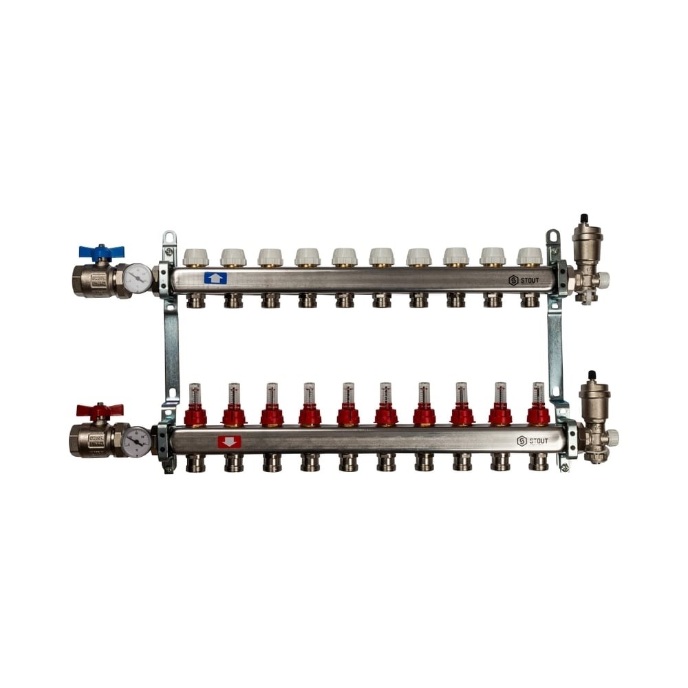 Коллектор из нержавеющей стали в сборе с расходомерами STOUT 10 выходов SMS 0907 000010 представляет собой прочное приспособление для подачи, распределения и регулировки теплоносителя. Изделие подключается в системы водяного отопления или теплого пола многоквартирных домов или домов индивидуальной застройки. Представляет собой надежный и долговечный элемент за счет: высокой пропускной способности; способности выдерживать давление до 10 бар; максимально выдерживаемой температуры теплоносителя до 100 °С; корпуса из нержавеющей стали; балансировочного расходомера.