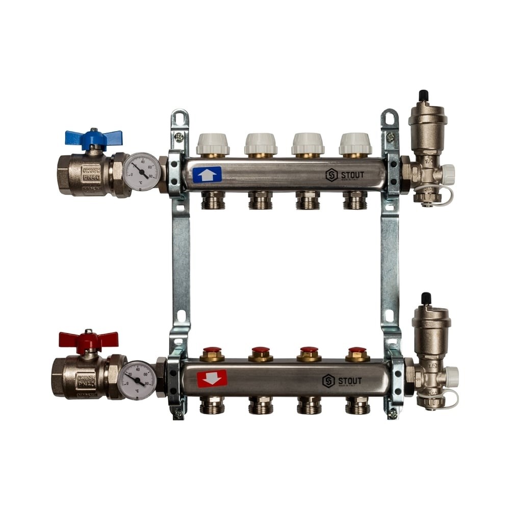 Коллектор из нержавеющей стали в сборе без расходомеров STOUT 4 выхода SMS 0912 000004 предназначен для подачи и распределения теплоносителя. Изделие подключается к системам водяного отопления или теплого пола. Представляет собой надежный и долговечный элемент за счет: высокой пропускной способности; способности выдерживать давление до 10 бар; максимально выдерживаемой температуры теплоносителя до 100 °С; корпуса из нержавеющей стали.