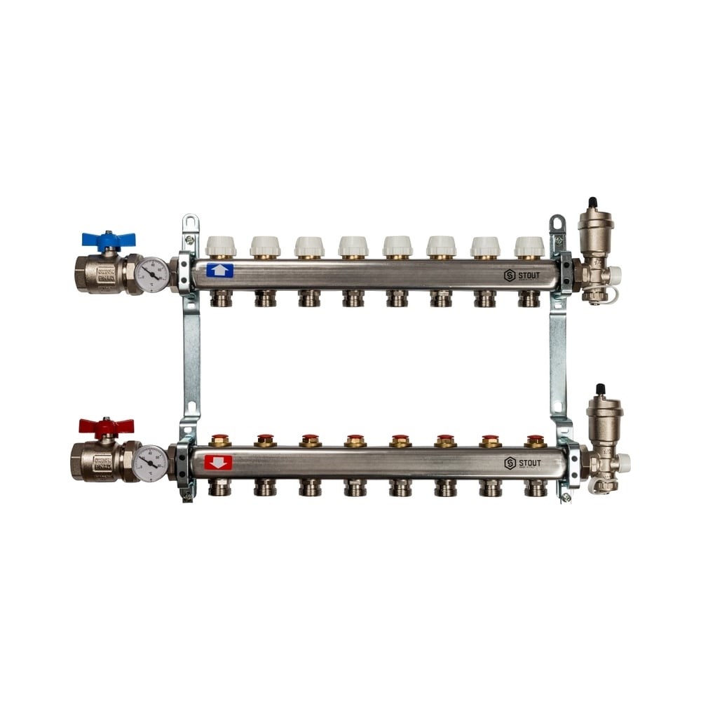 Коллектор из нержавеющей стали в сборе без расходомеров STOUT 8 выходов SMS 0912 000008 предназначен для направления и распределения теплоносителя. Изделие оснащено двумя шаровыми кранами, которые способны полностью перекрыть подачу воды в систему. Восемь запорно-балансировочных клапанов подразумевают подключение восьми узлов. Представляет собой надежный и долговечный элемент за счет: высокой пропускной способности; способности выдерживать давление до 10 бар; максимально выдерживаемой температуры теплоносителя до 100 °С; корпуса из нержавеющей стали.