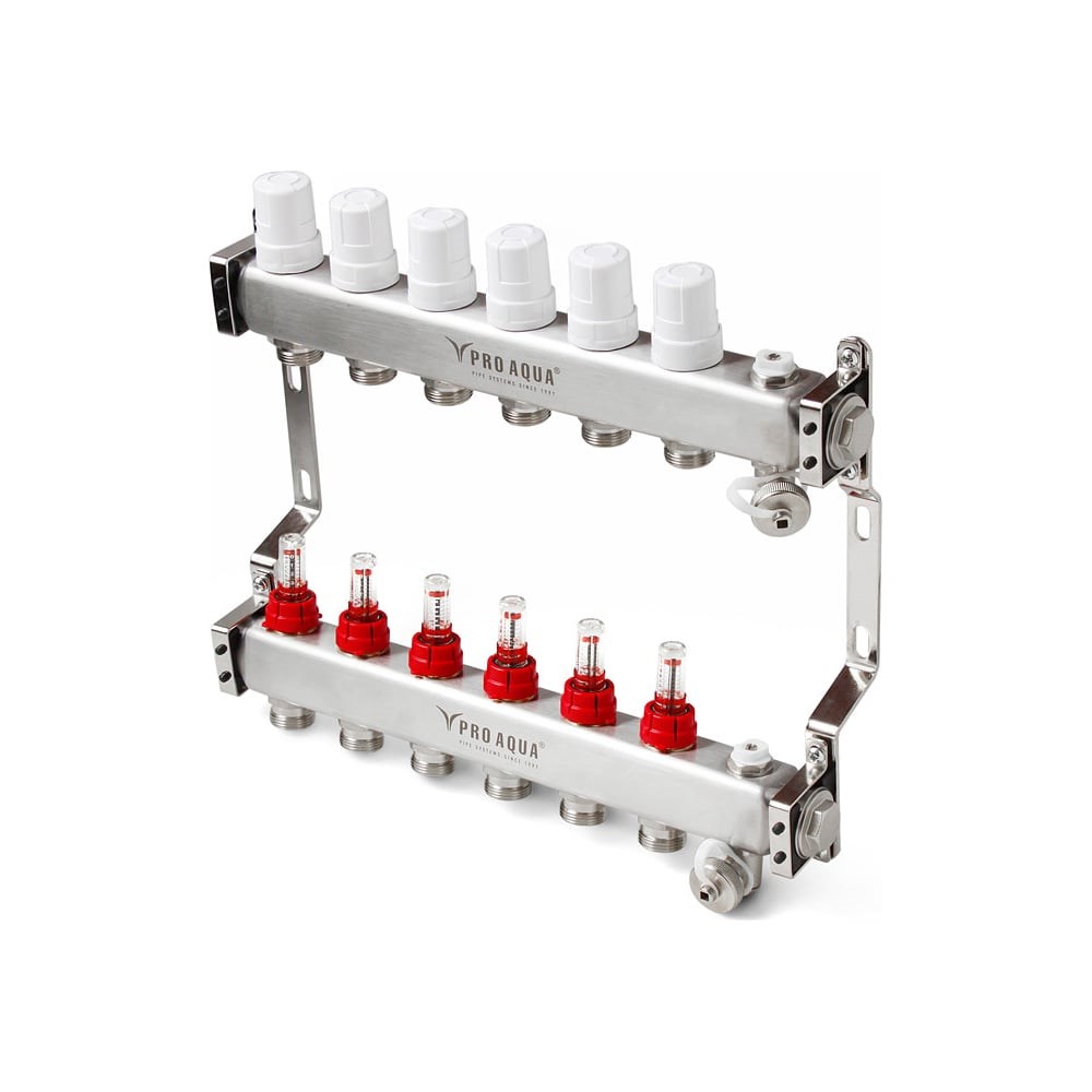 Коллекторный блок с расходомерами PRO AQUA 6 выходов, 380 мм, 1 x 3/4 V500MB.06b рекомендуется к использованию при монтаже и организации отопительной системы в доме, коттедже. С его помощью осуществляется распределение потока теплоносителя систем водяного отопления по потребителям (нагревательным приборам, контурам/петлям теплого пола). Составляющие выполнены из надежных, качественных материалов. Коллекторные группы способны работать как на водяном, так и на гликолевом теплоносителе.