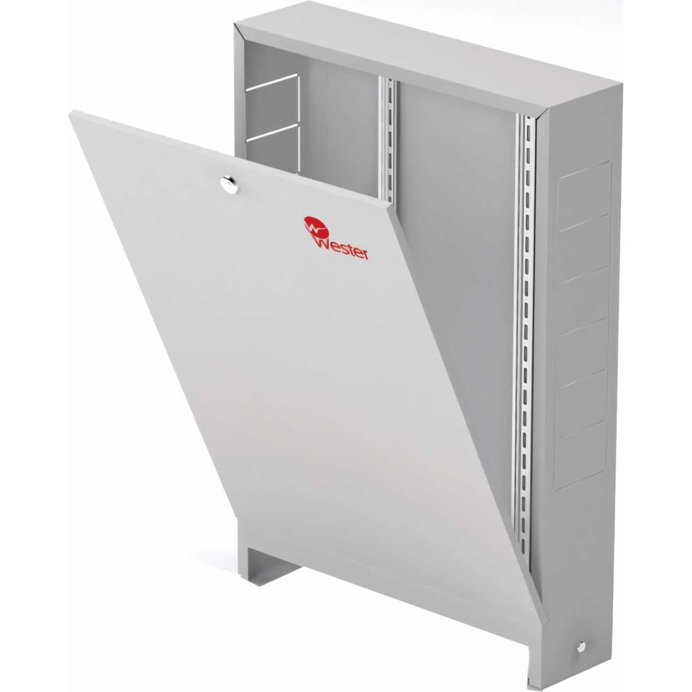 Шкаф коллекторный Wester предназначен для монтажа в нем распределительных коллекторов для систем отопления и водоснабжения и выполнен из оцинкованной стали. Шкаф коллекторный серии ШРН предназначен для наружного монтажа. Лицевые поверхности шкафа окрашены порошковой эмалью с предварительно нанесенной фосфатной пленкой для придания антикоррозионных свойств. В боковых стенках корпуса выполнена перфорация, сегменты которой удаляются в местах, удобных для подведения входящего трубопровода. Шкаф ШРН имеет регулировку по высоте до 63 мм за счет выдвижных ножек. Ножки имеют отверстия для крепления шкафа к полу. Откидная дверца шкафа имеет замок. Внутри шкафа установлены передвижные монтажные рейки, к которым крепят размещаемое оборудование.