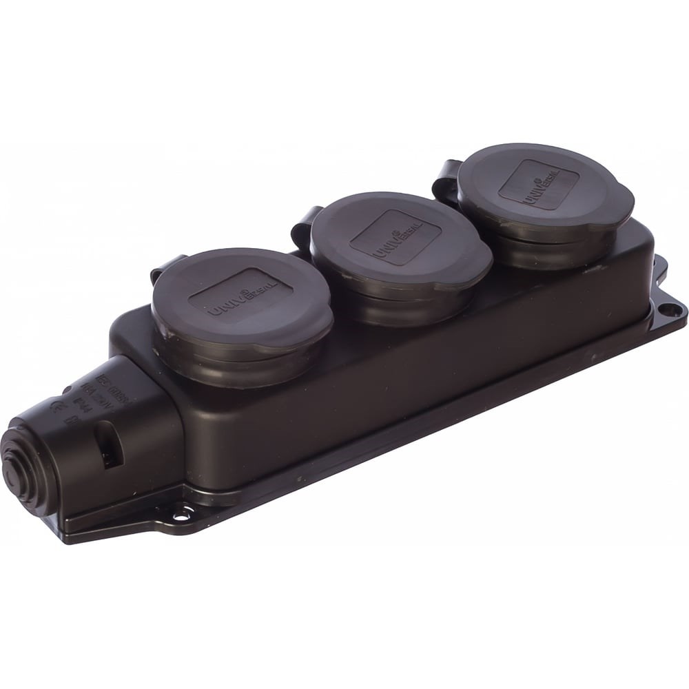 Тройная однофазная каучуковая колодка с заглушками UNIVersal 602230 - силовой разъем для создания надежных и защищенных соединений. Изделие дает возможность подключения одновременно трех электроприборов вне помещения, например: строительного оборудования, электроинструмента, приборов электроснабжения и пр.
