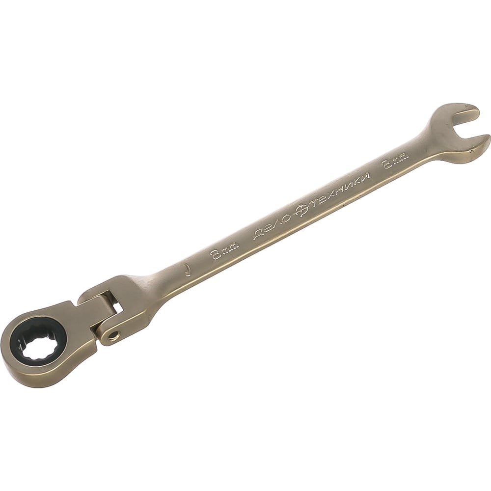 Комбинированный трещоточный ключ с шарниром 8 мм ДТ 200/5 Дело Техники 515408 имеет небольшой размер, что позволяет использовать его в труднодоступных местах или ограниченном пространстве. Применяется для монтажа и демонтажа резьбовых соединений. Корпус, выполненный из хромванадиевой стали, отличается повышенной прочностью. Изделие состоит из рожкового ключа на 8 мм и трещотки на шарнире. Трещоточный механизм с 72 зубцами плотно обхватывает профиль детали, не повреждая его.