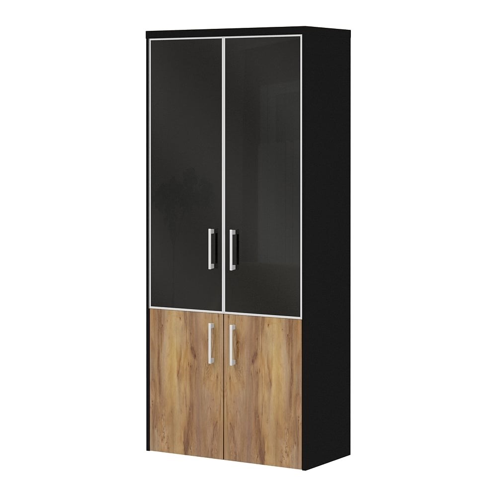 Комбинированный шкаф ФЕЛИКС 90x44x207 см таксония медовая ПК-ПРЛ-ШК205Х90АС2Д2-В1-1078 представляет собой корпус с одной горизонтальной стационарной стенкой и съемными полками. Сборка осуществляется с использованием эксцентриковых стяжек. Полки крепятся на металлических полкодержателях цилиндрической формы. Корпус устанавливается на регулируемых опорах для устойчивости на неровном полу. Каркас изготовлен из ламинированной древесностружечной плиты толщиной 18 мм, задняя стенка из плиты древесноволокнистой, толщиной 3,2. Отделка кромкой ПВХ 0,45 мм. Ручки - металлические скобы. Нижние двери глухие из ЛДСП 18 мм, устанавливаются на петли 90°, которые регулируются по высоте, ширине и глубине. Верхние двери - черное стекло в алюминиевом профиле, устанавливаются на петли 90°, которые регулируются по высоте, ширине и глубине.