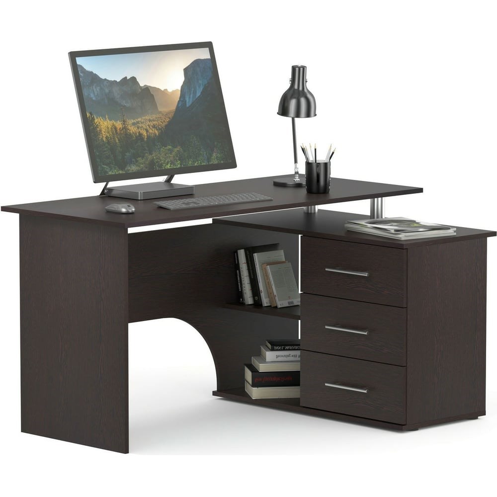 Компьютерный стол СОКОЛ правый венге КСТ-09 00-00010947 — идеальное решение для организации рабочего процесса как в домашнем кабинете, так и в офисной обстановке. Продуманная конструкция подразумевает две поверхности для размещения техники и подручных предметов, несколько открытых ниш и три выдвижных ящика для организации системы хранения книг, бумаг и канцелярских принадлежностей. Характеристики: Материал: ЛДСП 16 мм. Края обработаны кромкой ПВХ 0,4 и 2 мм. Тип направляющих: роликовые 350 мм. Максимальная нагрузка на столешницу, поверхность тумбы и нижнюю полку: 20 кг. Максимальная нагрузка на ящик и верхнюю полку: 5 кг. Ориентация сборки: правосторонняя (определяется по расположению тумбы).