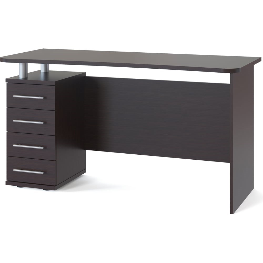 Компьютерный стол СОКОЛ КСТ-105 Венге 00-00011392 представляет собой универсальную модель с тумбой на четыре выдвижных ящика. При сборке тумбу можно расположить как справа, так и слева. Благодаря широкой столешнице можно организовать полноценное и удобное рабочее место. Передний край столешницы имеет эргономичный изгиб, что делает работу за столом более комфортной. В середине ее глубина составляет 560 мм. Внутренний размер ящиков составляет 370х223 мм, что позволяет разместить в них документы формата А4 и канцелярские принадлежности. Столешница, крышка и основание тумбы изготовлены из ЛДСП толщиной 22 мм с кромкой ПВХ 2 мм. Остальные детали – ЛДСП 16 с кромкой ПВХ 0,4 мм. Ручки-рейлинги выполнены из металла, шириной 128 мм. Задняя стенка тумбы выполнена из ДВП серого цвета. Примите это во внимание, если собираетесь устанавливать стол не у стены.