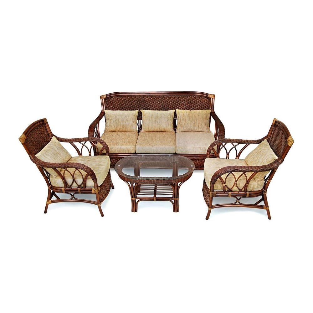Великолепный комплект для отдыха «Андреа» прекрасно впишется в интерьер загородного дома, летней веранды или сада. Компактный овальный столик со стеклянной столешницей, уютный 3х-местный диван и два высоких кресла в колониальном стиле изготовлены вручную из натурального ротанга. В дизайне используется несколько видов традиционного индонезийского плетения. Изысканная отделка в цвете «античный орех» выполнена методом тонирования и нанесения темной патины. Финишное покрытие — прочный матовый лак, устойчивый к УФ-излучению. Для большего удобства мебель комплектуется большими декоративными подушками кремового цвета.