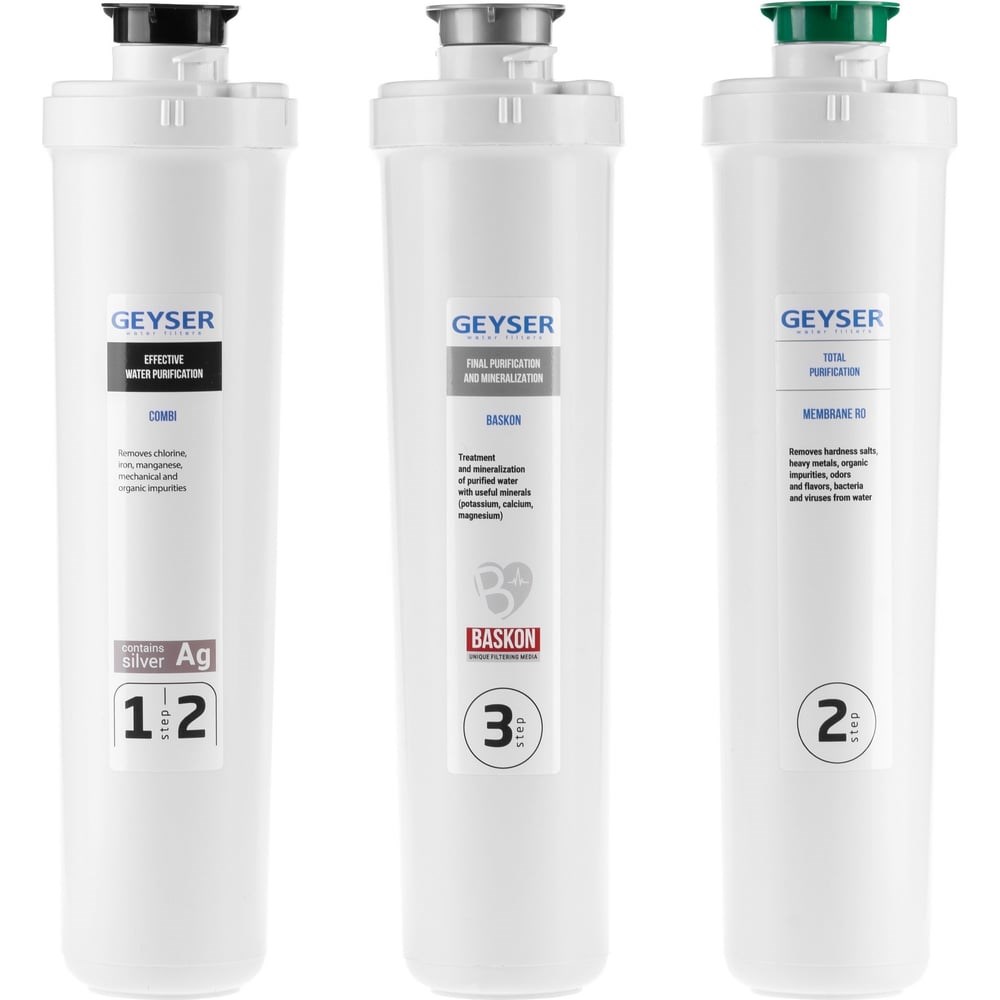Комплект картриджей предназначен для системы обратного осмоса Гейзер Престиж Смарт.Благодаря креплению QucickLock замена фильтрующих модулей выполняется очень быстро и без дополнительных инструментов. Достаточно вставить картридж и повернуть его до щелчка, сигнализирующего о герметичности установки картриджа.Разработанная компанией Гейзер технология минерализации Баскон позволяет получить чистую и полезную воду, насыщенную минералами (калий, магний, кальций). Очищенная вода имеет сбалансированный минеральный состав.Этапы очистки воды: 1. Картридж Комби предочистки 3 в 1 — обеспечивает эффективную предочистку и защищает мембрану. Создан на основе материала Арагон и высококачественного кокосового активированного угля (ресурс – до 7 000 л); 2. Обратноосмотическая мембрана для глубокой очистки воды (ресурс мембраны – до 3 500 л (чистой воды); 3. Картридж Баскон — насыщает воду полезными микроэлементами (ресурс – до 7 000 л). Характеристики:Максимальное рабочее давление: 7 атм;Скорость фильтрации: до 200 л/сутки*;Температура очищаемой воды: +4...+40 °С;Ресурс: до 12 мес**.*зависит от давления и температуры воды.**Зависит от качества исходной воды.