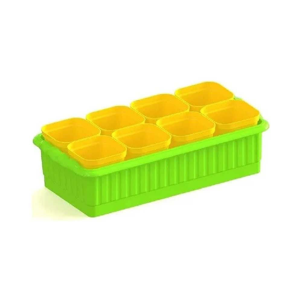 Комплект для рассады, состоящий из пластиковых горшков со съемным дном и ящика. Благодаря съемному дну вынимать кустик рассады из горшка можно легко и просто, при этом не повреждая корневую систему, а глубокий ящик обеспечит удобство размещения на подоконнике и легкую транспортировку рассады. Ящик можно использовать отдельно или ставить в него стаканчики.