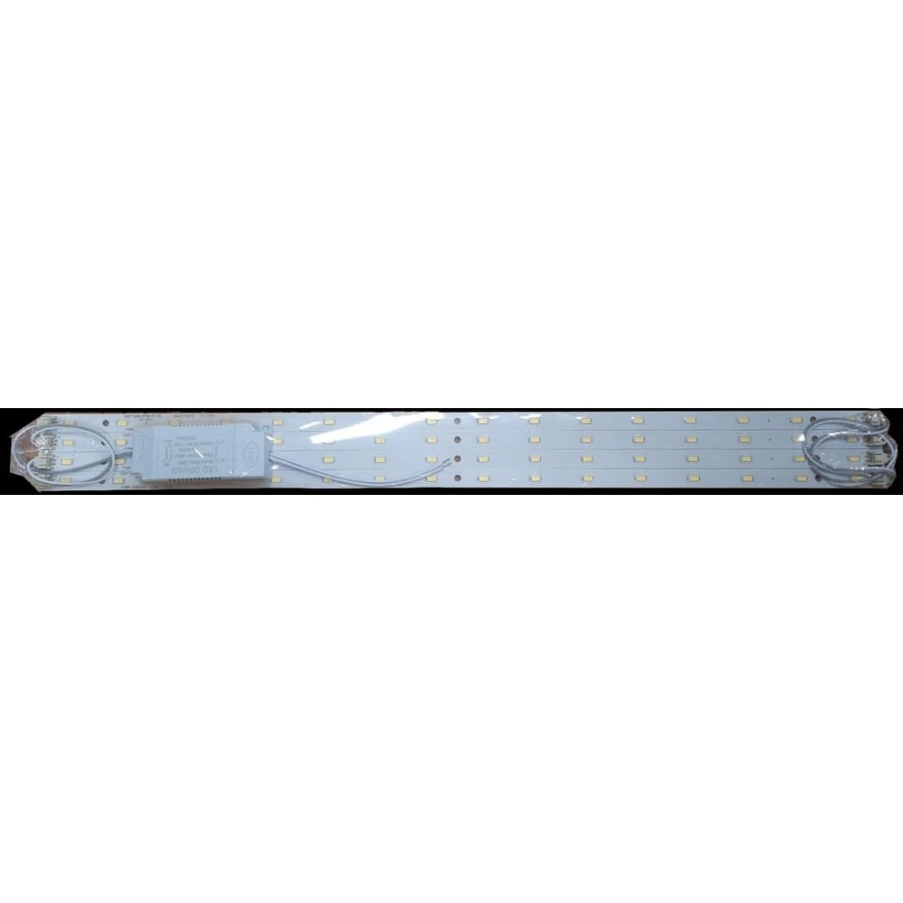 Ремкомплект создан по стандартам светильника «Армстронг» 595×595×25 мм. Комплект светодиодных линеек предназначен для замены люминесцентных ламп, а также для замены светодиодных линеек, вышедших из строя. Цветовая температура равна 4500 К, что соответствует холодному белому цвету свечения. Угол рассеивания светодиодов, используемых в изделии, равен 120 градусам, что позволяет полностью осветить плафон светильника и сделать освещение более качественным. Светодиодный набор линеек имеет длину 520 мм. Драйвер, обеспечивающий питание светодиодов, контактирует с линейками только в месте их подсоединения. Данное изделие работает от напряжения 220 В и не требует дополнительных устройств для подключения. 32 Вт; SMD 5730, в комплект входят линейки 4 шт., 4500 К, 100–110 Лм/Вт, 52 см, драйвер (высота 2,5 см, ширина 3,5 см, длина 8 см).