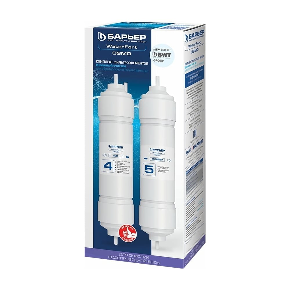 Комплект фильтроэлементов БАРЬЕР WaterFort Osmo финиш 4-5 ступени Р274Р00 - это комплект из двух картриджей, которые представляют собой финишный этап очистки воды в системе обратного осмоса WaterFort Osmo. Фильтрующие элементы отвечают за очистку от солей жесткости, органических соединений. Также изделия кондиционируют воду.