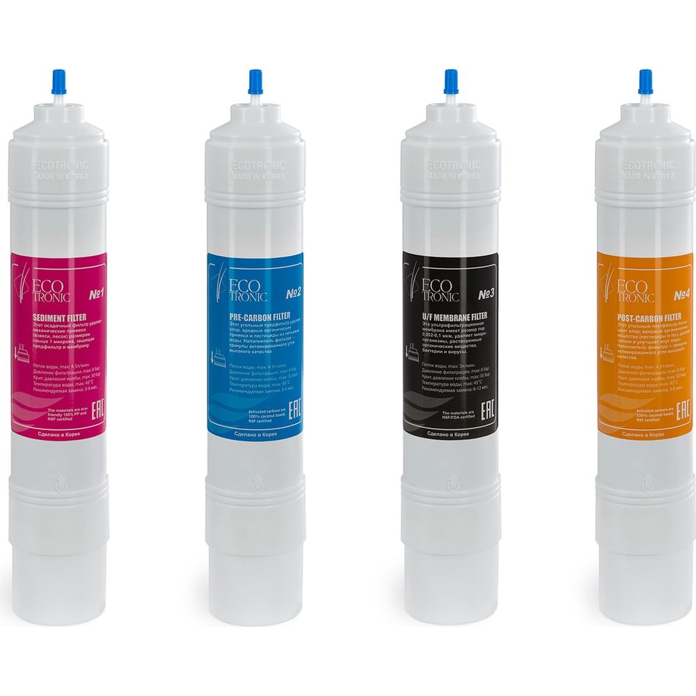 Комплект фильтров c UF 14 дюймов I-тип ECOTRONIC ETK7250/ 7250 для напольных пурифайеров с с ультра-фильтрационной мембраной UF мембраной (14 дюймов). Фильтр №1 Sediment filter. Осадочный фильтр удаляет механические примеси (взвеси, песок) размером свыше 1 микрона, защищая предфильтр и мембрану. Фильтр №2 Pre-carbon filter. Угольный предфильтр удаляет хлор, вредные органические примеси и пестициды из питьевой воды. Наполнитель - гранулы активированного угля. Фильтр №3 U/F membrane filter. Ультрафильтрационная мембрана имеет размер пор 0.002-0.1мкм, удаляет микроорганизмы, растворенные органические вещества, бактерии, вирусы. Фильтр №4 Post-carbon filter. Угольный постфильтр поглощает хлор, вредные органические вещества (пестициды и др.), удаляет запахи и улучшает вкус воды. Наполнитель - гранулы активированного угля. Тип фильтров - U. Вид фильтра - 14 дюймов. Производитель рекомендует производить замену фильтров: не реже 1 раза в 6 месяцев. Данный комплект подходит для пурифайеров с маркировкой после дефиса xx-U4L, где xx - серия и номер модели, U - ультрафильтрация, 4- ре ступени очистки, L - напольный. Ресурс каждого картриджа до 10 тыс. литров в зависимости от качества водопроводной воды.