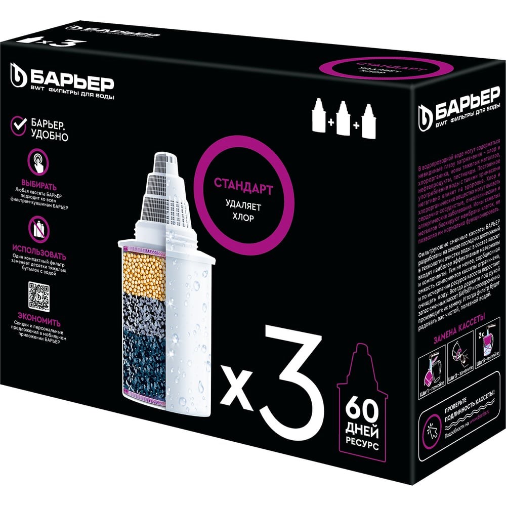 Комплект кассет для фильтров-кувшинов БАРЬЕР стандарт, 3 шт, удаляет хлор К043Р20 удаляет посторонние привкусы и запахи. Резьбовое соединение надежно фиксирует кассету и не дает попасть нефильтрованной воде в чистую. Ресурс зависит от качества исходной воды, но составляет не более 350 литров. Одна кассета БАРЬЕР способна заменить несколько сотен пластиковых бутылок. По окончанию ресурса кассеты можно сдать на переработку.