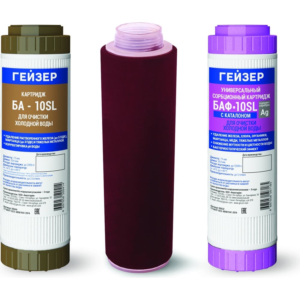 Комплект сменных картриджей К3 Гейзер 50083 используется для очистки водопроводной воды с повышенным содержанием железа системой Гейзер Классик. В комплект входит три картриджа -Картридж БА; Арагон; Сорбционный картридж (БАФ). На первой ступени очистки с помощью картриджа БА из воды удаляется избыточное растворенное железо (до 1 мг/л) методом каталитического окисления. На второй ступени очистки происходит умягчение воды, удаление из нее солей жесткости по классическому механизму ионного обмена. При окончательной очистке сорбционный картридж (БАФ) удаляет из воды хлор, органические примеси, снижает содержание железа и тяжелых металлов.
