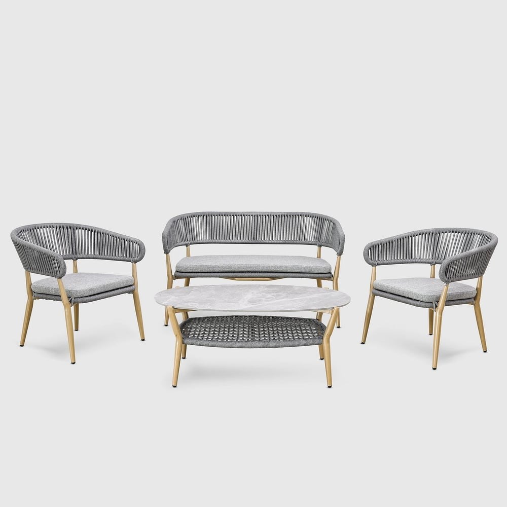Комплект мебели Самос от Konway состоит из 2 комфортабельных кресел, двухместного дивана-софы и журнального столика. Лаундж-зона изготовлена из алюминия с порошковым покрытием с отделкой под дерево, устойчив к ультрафиолетовому излучению и внешним воздействиям. Спинка и сидение из роупа диаметром 6 мм светло-серого цвета. На кресла и диван предусмотрена подушка толщиной 5 см со съемным чехлом. Столешница журнального стола с 5-миллиметровым закаленным стеклом с отделкой под камень.