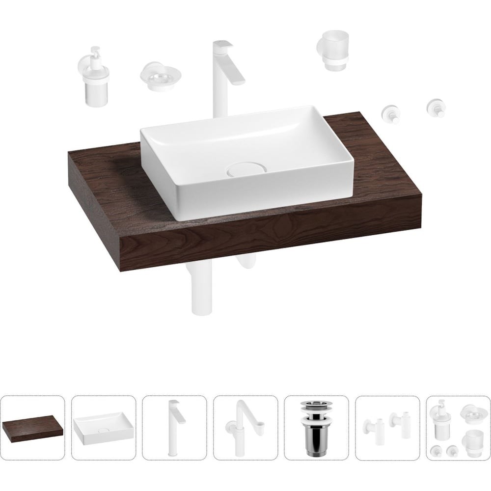 Комплексное предложение по специальной цене от Wellsee. СТОЛЕШНИЦА Основа столешницы из дерева Genuine Tree – высококачественная импрегнированная плита МДФ, пропитанная специальным составом для усиления стойкости материала и максимальной защиты от влаги, перепадов температур, грибка и плесени. Максимальная влагостойкость достигается за счет укрепления торцов изделия массивом дерева. Далее поверхность столешницы покрывается натуральным шпоном и дополнительно обрабатывается бейцем, что позволяет получать уникальную для каждого покупателя текстуру и выразительный цвет. РАКОВИНА Накладная раковина Pure BY Wellsee с первого взгляда покоряет своей чистотой и безукоризненностью линий. Изысканные формы и внешняя хрупкость конструкции смягчат самый неординарный интерьер ванной комнаты. Наличие керамического клапана на слив деликатно подчеркнет эстетику умывальной зоны. СМЕСИТЕЛЬ Надежный латунный смеситель с испанским картриджем 35 мм обеспечивает высокую точность управления напором и температурой воды, благодаря которому наслаждаться плавным скольжением ручки и мягким ходом смесителя можно более 10 лет. Регулируемый аэратор Neoperl с технологией AIRflow² позволяет скорректировать направление потока, уменьшает разбрызгивание и приглушает шум воды. ВАННАЯ КОМНАТА В СТИЛЕ WELLSEE Завершить современный интерьер ванной комнаты можно с помощью сифона, донного клапана, угловых вентилей (2 шт), набора аксессуаров (5 шт) и элегантными зеркалами 7 Rays' Spectrum.
