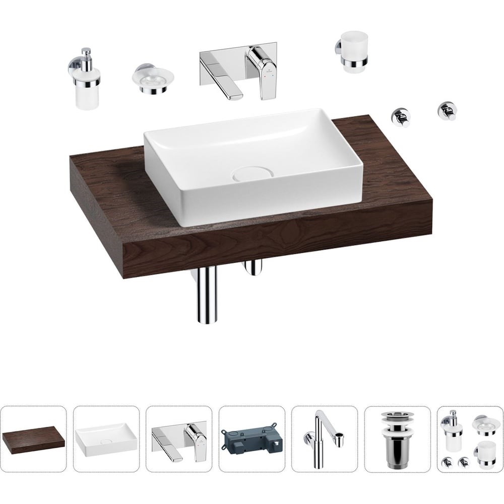 Комплексное предложение по специальной цене от Wellsee. СТОЛЕШНИЦА Основа столешницы из дерева Genuine Tree – высококачественная импрегнированная плита МДФ, пропитанная специальным составом для усиления стойкости материала и максимальной защиты от влаги, перепадов температур, грибка и плесени. Максимальная влагостойкость достигается за счет укрепления торцов изделия массивом дерева. Далее поверхность столешницы покрывается натуральным шпоном и дополнительно обрабатывается бейцем, что позволяет получать уникальную для каждого покупателя текстуру и выразительный цвет. РАКОВИНА Накладная раковина Pure BY Wellsee с первого взгляда покоряет своей чистотой и безукоризненностью линий. Изысканные формы и внешняя хрупкость конструкции смягчат самый неординарный интерьер ванной комнаты. Наличие керамического клапана на слив деликатно подчеркнет эстетику умывальной зоны. СМЕСИТЕЛЬ Надежный латунный смеситель с испанским картриджем 35 мм обеспечивает высокую точность управления напором и температурой воды, благодаря которому наслаждаться плавным скольжением ручки и мягким ходом смесителя можно более 10 лет. Регулируемый аэратор Neoperl с технологией AIRflow² позволяет скорректировать направление потока, уменьшает разбрызгивание и приглушает шум воды. ВАННАЯ КОМНАТА В СТИЛЕ WELLSEE Завершить современный интерьер ванной комнаты можно с помощью сифона, донного клапана, угловых вентилей (2 шт), набора аксессуаров (5 шт) и элегантными зеркалами 7 Rays' Spectrum.