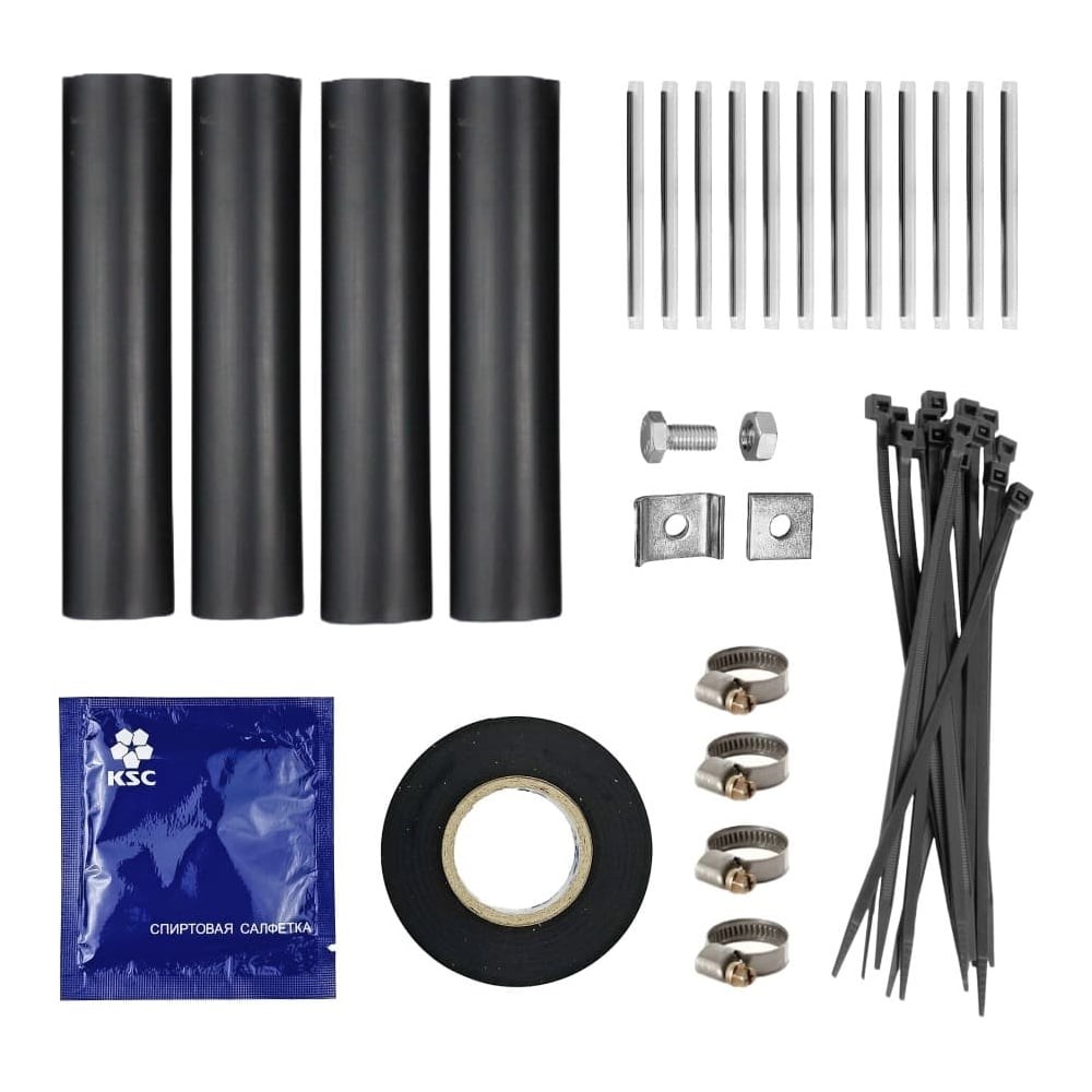 Монтажный комплект для заделки KSC МУРР - муфты универсальной оптической ремонтно-разветвительной. Фирменные термоусаживаемые трубки ТУТ KSC КСТМ 19/5 (отрезок) 100 мм позволяют загерметизировать все 4 кабельных ввода муфты KSC МУРР. Комплект для фиксации силового элемента цабеля (винт, гайка, скоба 2 шт)отвечает за креплениецентрального силового элемента кабеля (ЦСЭ ОК) и позволяет заземлить узел монтажа. Червячные хомуты Ø = 8/12 (4 шт) предназначены для фиксации (крепления) оболочки кабеля на каждом из четырёх кабельных вводах муфты KSC МУРР. Комплект из десяти (10 шт)нейлоновых стяжек (2,5 x 100 мм) позволяет безопасно зафиксировать волоконные-оптические модули монтируемого кабеля (ОМ), оптические волокна (ОВ), пучки из кевларовых нитей или арамида (в зависимости от конструкции кабеля) по периметру тела оптической муфты KSC МУРР, а так же на всей площади ложемента и интегрированной сплайс-кассеты муфты. Изолента KSC (1 шт) необходима для осуществления подручных процессов при монтаже муфты KSC МУРР, а так же может быть использована для герметизации кабеля в кабельном вводе вместо термоусаживаемых трубок, как опция способа монтажа и заделки оптической муфты KSC МУРР. Спиртовая салфетка KSC (1 шт) сослужит службу при снятии гидрофобного заполнителя с кабеля при его разделке, а так же при подготовке волоконных модулей и волокна к сварке. Комплект из двенадцати КДЗС 45 мм (12 шт) служит для защиты мест сварных соединений и рассчитан на максимальное кол-во сварок ложемента муфты МУРР.